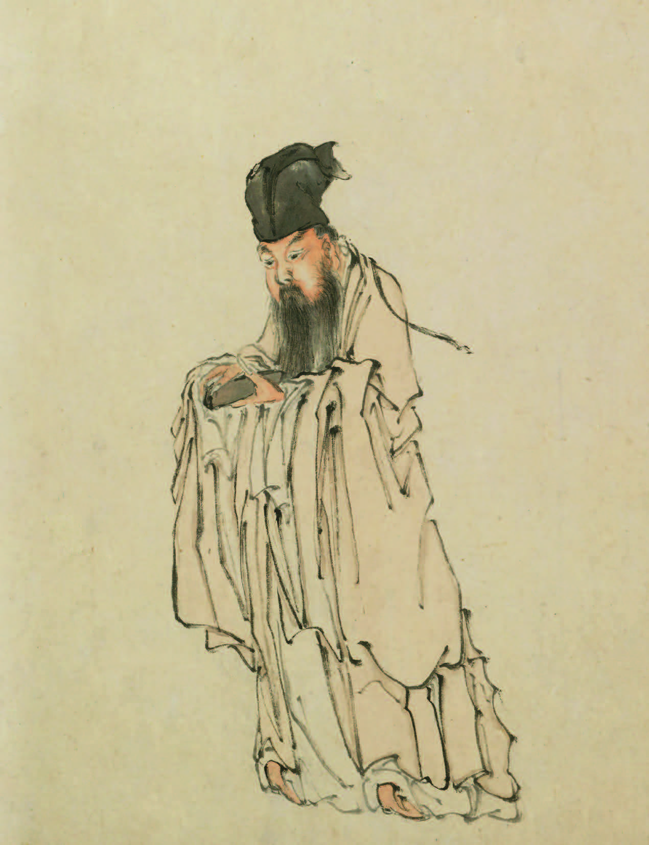 此苏轼笠屐像所据粉本传为苏轼友人李公麟之作。苏轼晚年被贬海南时,曾在访友途中遇雨,他向农人借来斗笠和木屐,农人争相笑看,而苏轼坦然处之。此图表现苏轼身处逆境而安之若素的生活态度,此类笠屐像也成为后世在描绘苏轼形象时的一种经典范式。