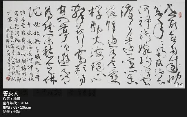沈鹏精行草、善隶楷,草书酣畅淋漓、随意所适,楷隶古拙沉雄、收放自如,所书多自作诗文,书面文心。致力美术、书法理论研究,提出中国书法可持续发展的理念,古典诗词发表逾千首,出版诗词选集及各类书法集册四十余种。