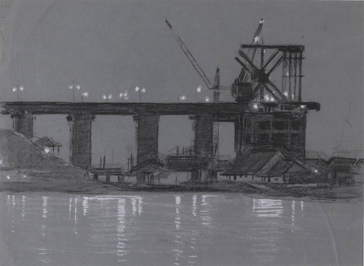修建中的桥墩 李斛 素描 纸本 20世纪50年代 长23cm×34.5cm 中国美术馆藏