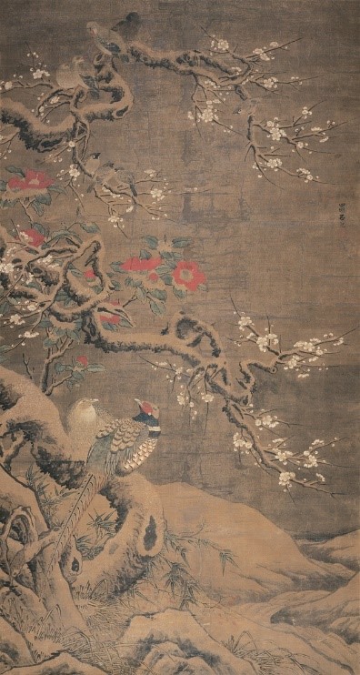 吕纪 锦鸡山茶图轴 绢本 183.1×97.8cm 明 浙江省博物馆藏