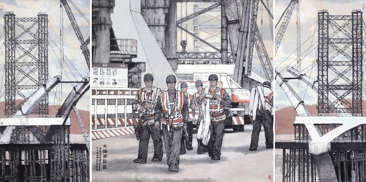 2.大桥建设图 蔡超 国画 400×200cm 2022年 个人收藏