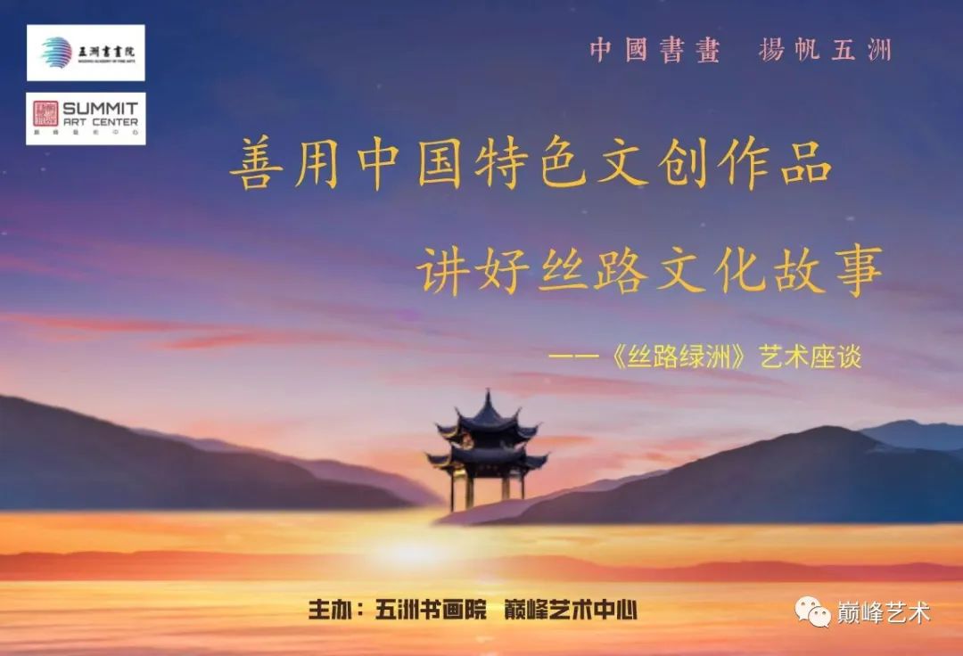 为更好总结文创作品《丝路绿洲》的成功经验,五洲书画院、巅峰艺术中心于2022年8月31日,特别邀请了中国美术出版社原总编欧京海;中国驻突尼斯、阿尔及利亚原大使、外交学会副会长兼秘书长刘玉和;中国社会主义文艺学会书画专业委员会主席、中国红十字会总会事业发展中心顾问王少跃;中国楹联协会副会长兼法人肖良平;北京服装学院教授、著名画家翟鹰;中国社会主义文艺学会书画专业委员会副主席蔡成刚;著名画家陈溪峋、陆江、郑美秋;著名书法家、5届兰亭奖获奖者丁子同;青年书法家、兰亭奖获奖者马志刚等30余位专家、学者,就如何"善用中国特色文创产品,讲好丝路文化故事"这一主题进行了全方位座谈、交流。