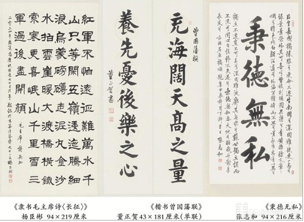 在书法方面,展览展示了楷书、行书、草书、篆书等不同书体的作品,如杨臣彬的《毛主席诗长征》、董正贺的《楷书曾国藩联》、张志和的《秉德无私》等,不仅体现了当代博物馆人对书写技法的精湛掌握,也反映了他们对历史和中华优秀传统文化的深刻理解。