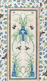 以清华大学艺术博物馆所藏的白色缎地蓝绿花鸟挽袖为例,它长70厘米、宽38.6厘米,由两条同样图案和色彩的挽袖拼缝组合,并外加多重缘边。很多挽袖刺绣精美,并非用于实际穿着,而是被缝合在一起并镶边,成为家居装饰品。这件挽袖以白色缎为地,选用青色、黄色、浅绿、水绿、深蓝、浅蓝、月白以及雪青色等素雅丝线,运用传统平针绣中的直平针、斜平针及套针绣等刺绣工艺,绣出燕子、兰花、寿石、蝴蝶等吉祥图案。外缘以白缎地绣蓝绿两色吉祥花卉、蝴蝶图镶宽边。