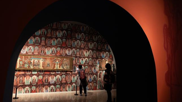 走进“墨韵文脉——甘肃丝路艺术珍品展”的展厅,观众不禁感叹,沉浸式的空间、场景化的展陈让文物仿佛“活”了起来,敦煌展厅以1∶1复刻洞窟穹顶,清晰呈现敦煌壁画纹路,与当代画家临摹作品相呼应;15块肃府本《淳化阁帖》刻石放置于特别定制的PVC格子中,兼顾安全性与观赏性,与旁边的甲骨文、青铜铭文、简牍形成延续。