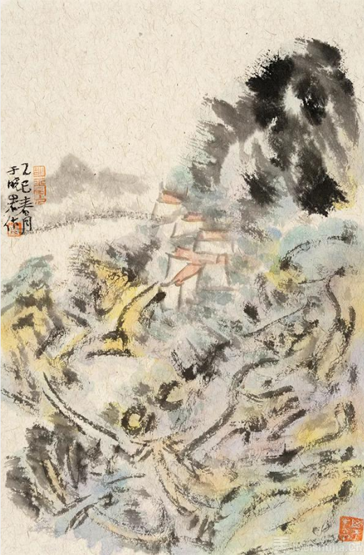 入境之微,动静之间。感悟山水恣意笔墨实感意境非自然之再现,须于“拈花微笑里领悟微妙至深的禅境。”“恽南田以‘落叶聚还散,寒鸦栖复惊’(李白),品一峰(黄子久)笔,是所谓孤蓬自振,惊沙坐飞,画也而几乎禅矣!”(戴醇士语)超旷心灵,所谓“超以象外”。