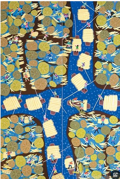 邹青寰是南京艺术学院的在读博士生,本科和硕士主攻中国山水画。出于对江南鱼米之乡的喜爱,她开始尝试乡土绘画创作,并将中国画的一些技法,比如散点透视,运用在乡土绘画的创作中。展出的作品《沃野欢歌话丰年》采用俯视的视角表现江南鱼米之乡欢庆丰收场景,画面中还植入了招牌灯、梅花糕、灯彩、莲湘舞等非遗元素。