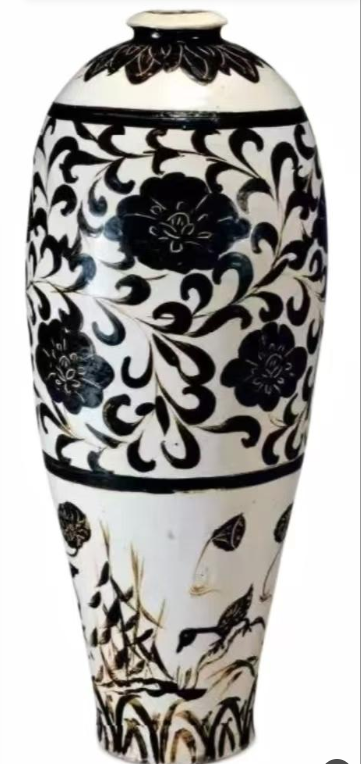 河北博物院藏金代白釉黑彩牡丹芦雁图梅瓶,1972年出土于河北献县,器型修长匀称,小口,折沿,短颈,溜肩。上腹微鼓,下腹渐收至底,底内凹成圈足,整体上给人以妩媚但不失端庄之感。梅瓶胎质疏松,呈浅灰色,通体施白色化妆土,乳白色釉,口沿下绘一周覆莲纹。上腹部于两周弦纹间,以黑料绘画六朵缠枝牡丹,黑白对比强烈,花朵雍容丰满,枝叶洒脱奔放,线条流畅,疏朗有致。