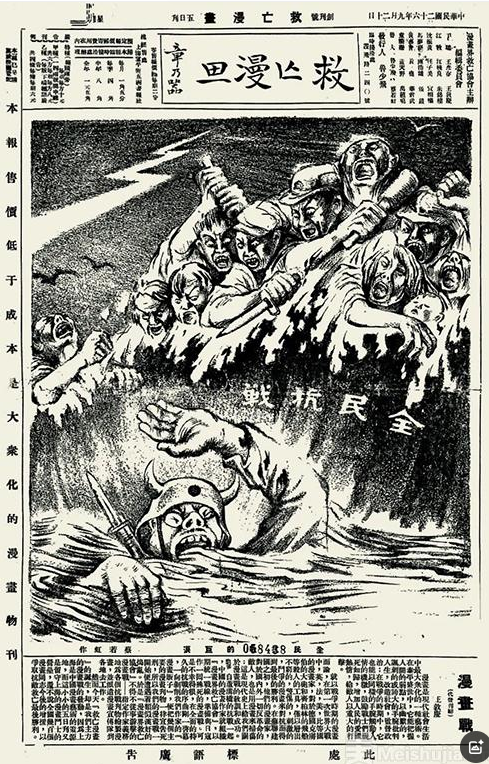 在这一点上,作为新兴大众美术的木刻和漫画率先承担起对敌斗争的重担,成为美术救亡运动的先锋。在全面抗战之初,赖少其就尖锐指出:“在内容上,中国抗战以前的绘画,除木刻和一部分的漫画外,都不注重内容,即便有,也是一种含有毒质的东西。”全面抗战时期的木刻运动直接承续了左翼美术运动的基调,可以说是“中国艺术中反帝反封建以至成为反日的前哨”。漫画界在全面抗战之前被认为“没有一定的目标和路向”,部分作品甚至“纯粹是小资产者自由主义的作风”。许多漫画刊物也往往呈现出严肃与消闲相交织的双重面孔。但在全面抗战之后,漫画家被迅速地团结和组织起来,漫画必须成为“笔杆抗战的先锋”,成为多数创作者的共识。