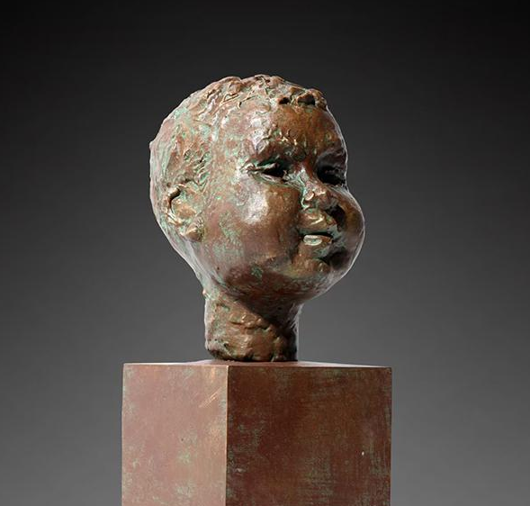 我创作的雕塑《阿宝》,灵感来源于好朋友的孩子——两岁的阿宝。阿宝天生面部轮廓比较深,额头饱满,眉弓很高,两只眼睛像嵌进去的黑葡萄,鼻梁也很高,鼻头微微翘起来。脸上婴儿肥还没有褪去,肉乎乎的小脸蛋总是红扑扑的,嘴巴并不大,平时爱微微张着。头发有点“自来卷儿”,密密地贴在头皮上,两只耳垂大大的,是民间传说中的“有福之相”。看到阿宝,我就在想,这个孩子简直就是一件天然的雕塑作品,于是就用泥巴把这个形象塑造了出来。
