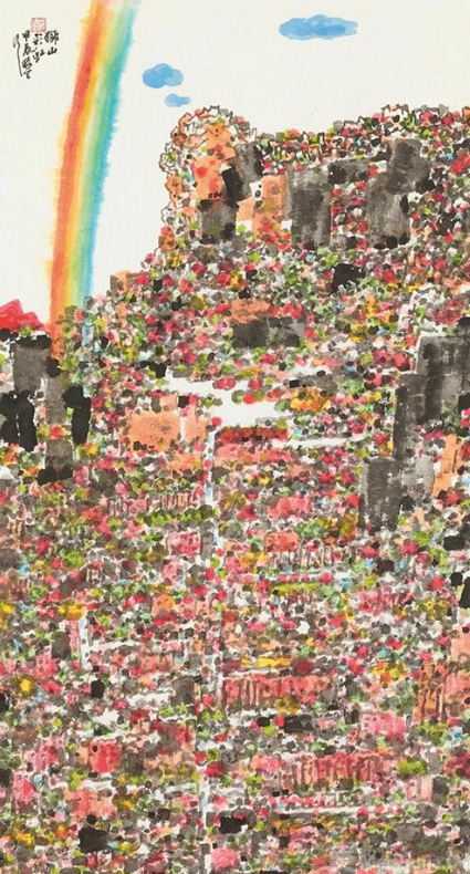 传统山水画以“三远法”构建三维空间,而林天行则转向“平面化”“饱满化”的构图,以鸟瞰视角重构世界,让画面充满现代都市的几何美感与节奏张力。在《景象香港》系列中,这种构图尤为明显:《新界晴雨》采用放射式构成,从高空俯瞰香港的山与海,泼墨的色块如云层翻滚,街灯的线条如琴弦纵横,鱼群似在空中跳跃,房屋似在倾听海浪,所有元素在平面上共生,却因色彩的层次生出空间纵深感;《码头》描绘繁忙的香港码头,“灯火辉煌,水天一色,富强烈节奏的线条穿插其间”,传统留白被填满,取而代之的是都市的拥挤与活力,恰如香港“寸土寸金”的城市特质。何佳霖在《一半天宫》中评价林天行的构图“线与线的关系,物体与物体的互相制约,和谐且富有个性”。他的画面极少留白,却不显杂乱,秘诀在于“取舍与重组”——他会解构传统山水的形态,提取自然与都市中的核心元素,再以抽象的逻辑重新排列。如《狮山云涌》中,云被披上金色,与狮子山融成一片,“稠密与稀疏相间有序”,每一朵云都是“一次回眸与驻足”,既象征香港的凝聚力,又暗含“狮子山精神”的坚韧。这种构图,既是对现代都市“纵横交错”视觉体验的回应,也是对中国传统“散点透视”的创新——不局限于单一视角,而是将不同时间、空间的景象压缩于一画,形成超现实的“意象空间”。