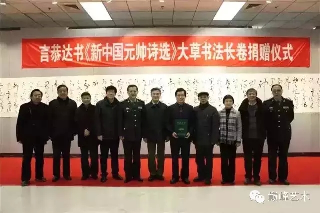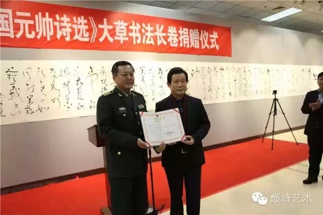 近日言恭达向中国人民革命军事博物馆捐赠《新中国元帅诗选》大草书长卷仪式在京举行。军事博物馆副馆长马琳杰接受捐赠,并向言恭达先生颁发收藏证书。