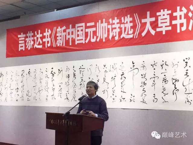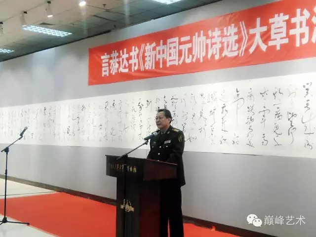 言恭达(公达),江苏省常熟人。全国政协委员、中国书法家协会顾问,国家一级美术师。据介绍,这幅《新中国元帅诗选》书法长卷长24.5米,宽1米,是在抗日战争暨世界反法西斯战争胜利70周年的背景下,为贯彻党的十八大精神和强军战略,落实中央军委关于加强军事文化建设的意见而创作的。
