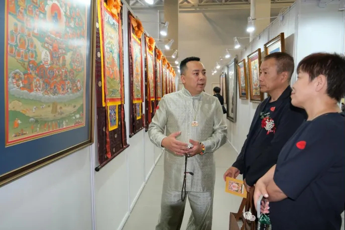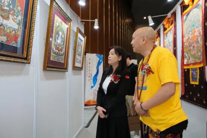 香港中文大学教授学愚代表《丝路佛缘书画展》组委会为入选《丝路佛缘书画展》的高僧大德、护法居士、佛教学者、专家和艺术家颁发了“丝路佛缘贡献奖”,唐卡画家杨子和桑吉才让作为获奖代表上台领奖。