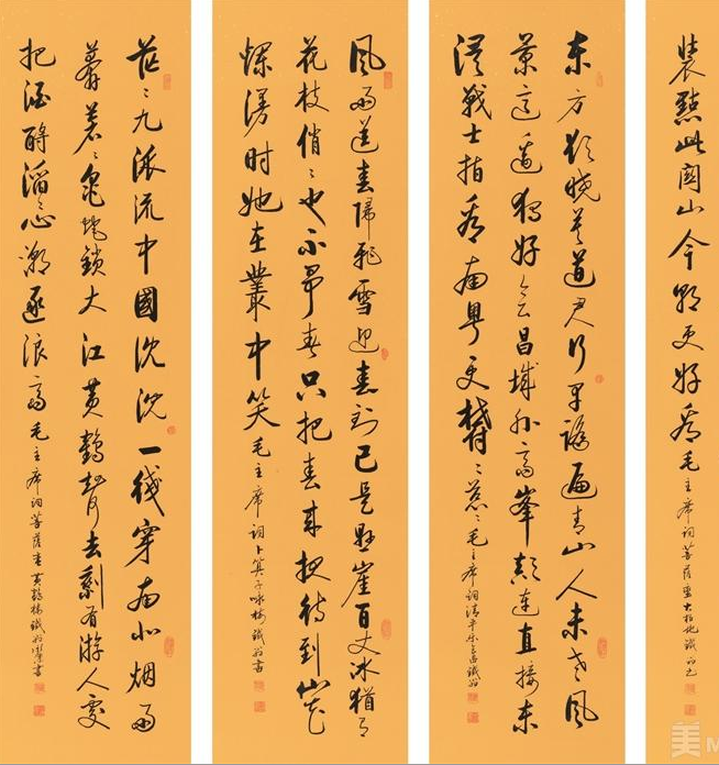 史永深书毛泽东词作,从右至左依次为《菩萨蛮·大柏地》《清平乐·会昌》《卜算子·咏梅》《菩萨蛮·黄鹤楼》